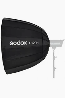 The Godox P120H is a 120cm deep parabolic softbox designed with a Bowens mount for wide compatibility with flashes and continuous lights. Its deep profile provides directional, wrap-around light with natural fall-off, making it an excellent choice for portrait, fashion, and commercial photography as well as cinematic video lighting.
