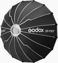 The Godox QR-P90T is a 90cm parabolic softbox from the Godox Quick Release (QR) series, designed for fast setup, portability, and professional light control. With its deep parabolic shape, it produces soft yet directional lighting with smooth falloff, perfect for portraits, fashion, beauty, and video production. The included grid further enhances light control by narrowing the beam and reducing spill.