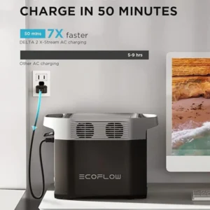 Charges from 0% to 80% in just 50 minutes and 100% in 80 minutes via standard AC outlet, thanks to EcoFlow’s patented X-Stream technology. -